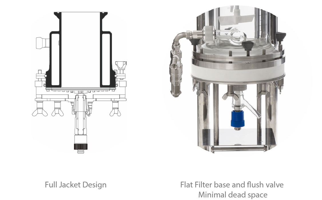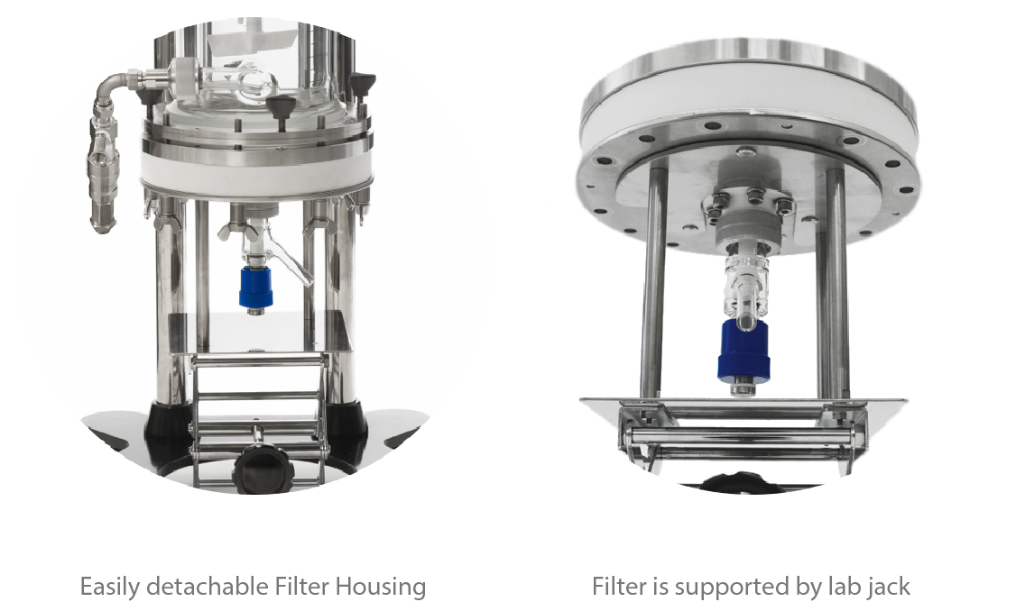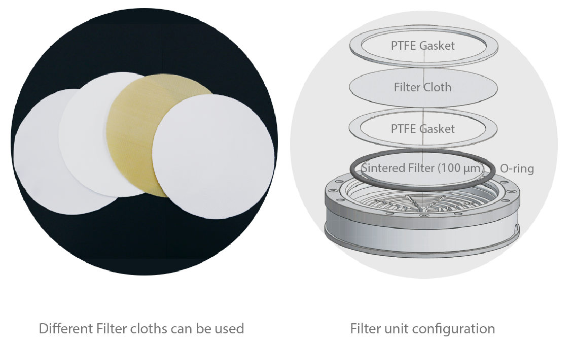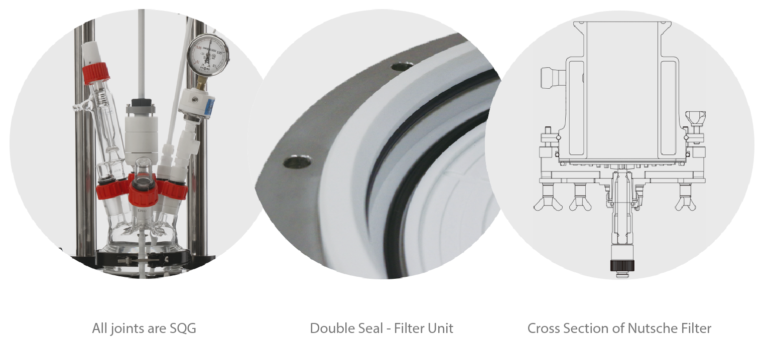 Our filtration part is meticulously designed to perform washing and filtration effectively. The gasket with O-ring forms a perfect seal between the glass and the PTFE plate.