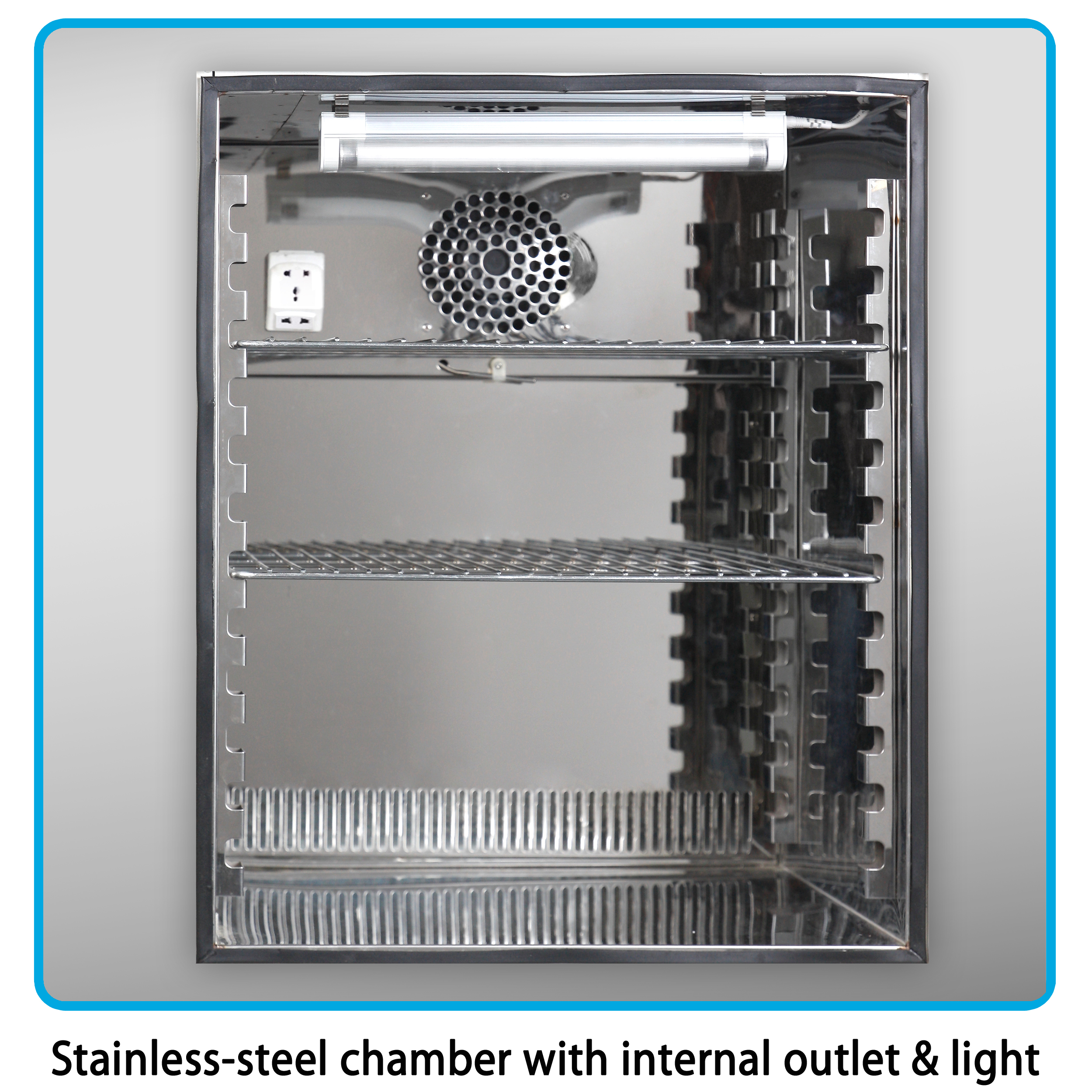 Despite its small size, the incubator features a relatively large 20L chamber with the capacity for flasks and bottles up to 2 liters. Two removable, stainless-steel shelves are included. The shelves are perforated to improve airflow within the chamber.