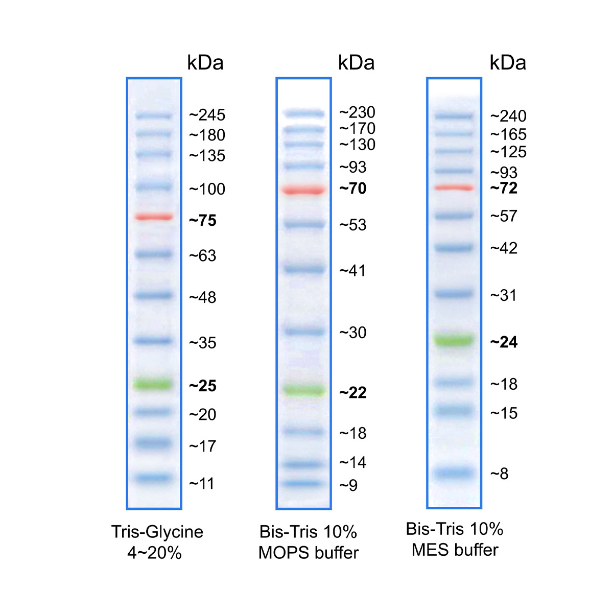 - Broad range: 10-245 kDa (Tris-glycine-SDS running buffer)