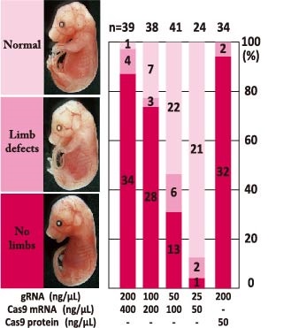 Fgf10 homozygous mutant embryo have an easily detectable limbless phonotype. Electroporation of Cas9 mRNA (Cas9 Protein) and gRNA enables genome editing of Fgf10.