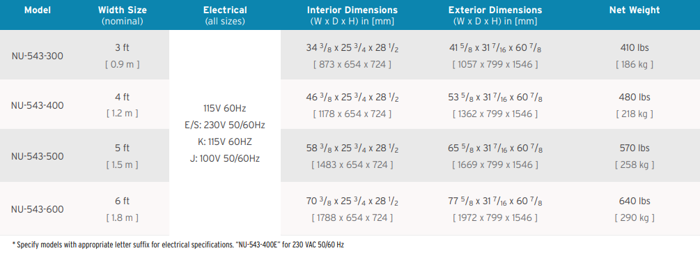 The NU-543 carries the LabGard® value proposition across the boundaries of geography and scientific applications by offering the broadest choice of configurations. This model features a dual thermistor airflow sensor and alphanumeric display for laboratories requiring a clear measurement of their cabinet’s performance and a choice of three NSF listed work access openings for procedures needing ergonomic access to the work zone. The cabinet can optionally be made with a smooth interior for procedures such as pharmacy compounding and always includes a prop up work tray to ease regular cleaning under the work surface. Double exhaust filters can be fitted to meet the requirements of an application or national guidelines. A truly global product, models are available that meet NSF/ANSI 49 and EN 12469, feature multilingual displays, and can ship from multiple locations around the world.